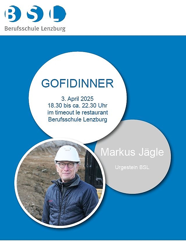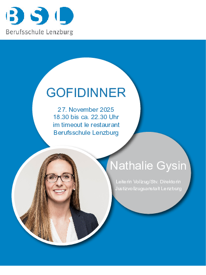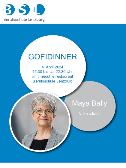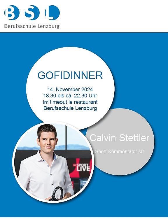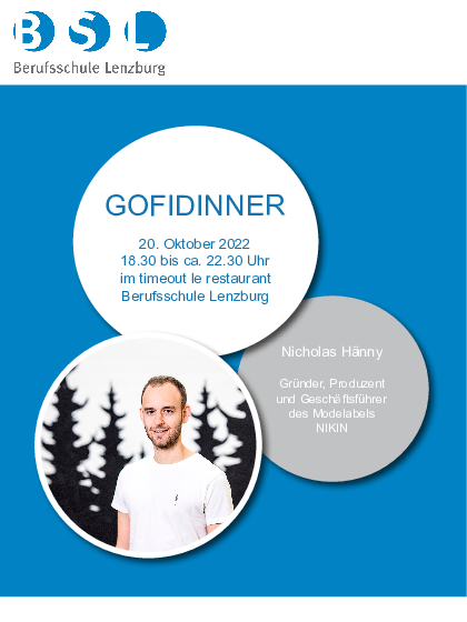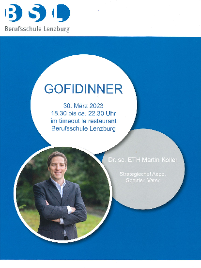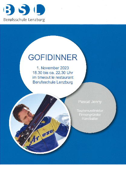 Zwei- bis dreimal jährlich führt die Berufsschule zusammen mit dem timeout restaurant das bereits traditionelle GOFIDINNER durch. Ein kulinarisch – kultureller Anlass, an welchem interessante Persönlichkeiten in drei Blöcken Hintergründe/Geschichten zu ihrer Person zum Besten geben.